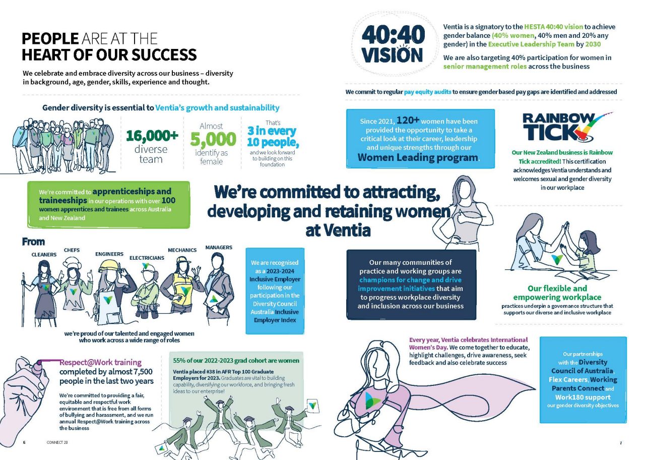 We are committed to increasing the number of women at Ventia in senior leadership roles to 40% by 2030, and our talent pipeline, learning and development opportunities and policies and procedures provide the foundations to ensure we retain, develop and attract more women in our organisation.